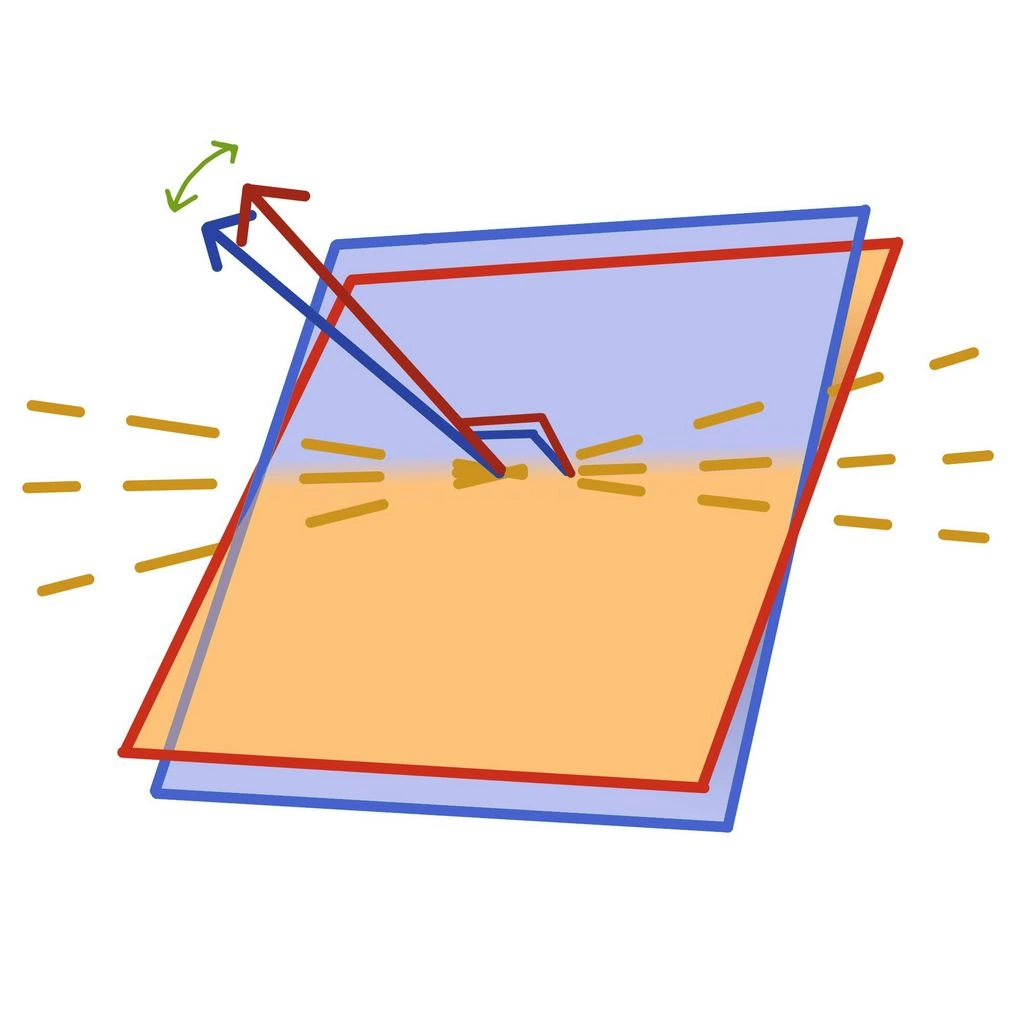 What happens though when those two polygons are almost coplanar? Well, the plane normals can become very close to being identical. Variations in floating-point precision can start to have an effect on the results of the cross product calculation, which in turn can lead to variations in the direction of the computed intersection vector, as shown in an exaggerated form in the image on the right.