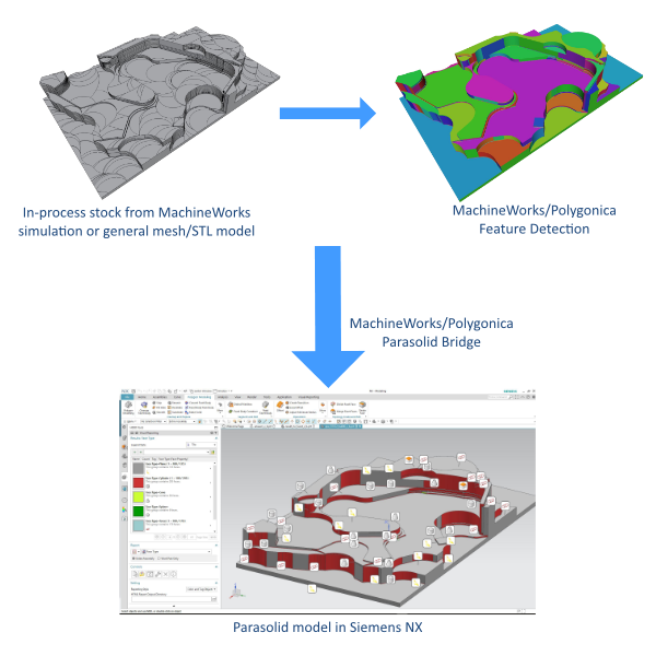 The Parasolid Bridge for Polygonica also generates a Parasolid model but based on a general polygon mesh rather than an in-process stock model.